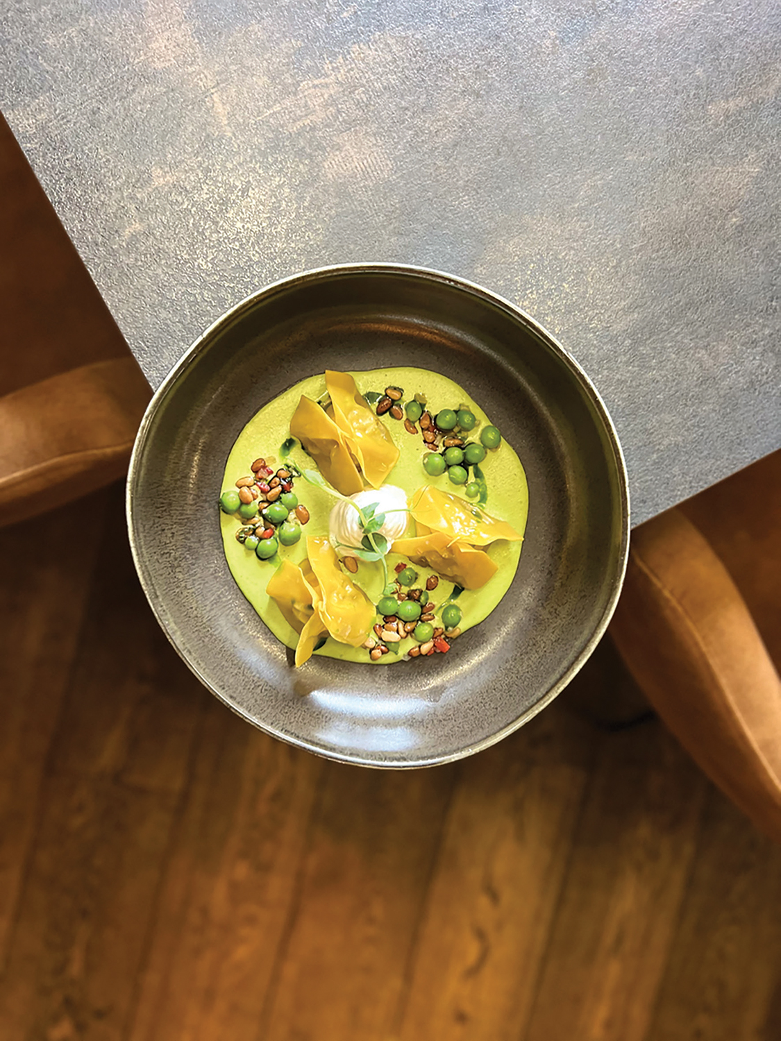 Raviole vapeur au porc ibérique, Ricotta et citron confit Crème de petits pois à la menthe