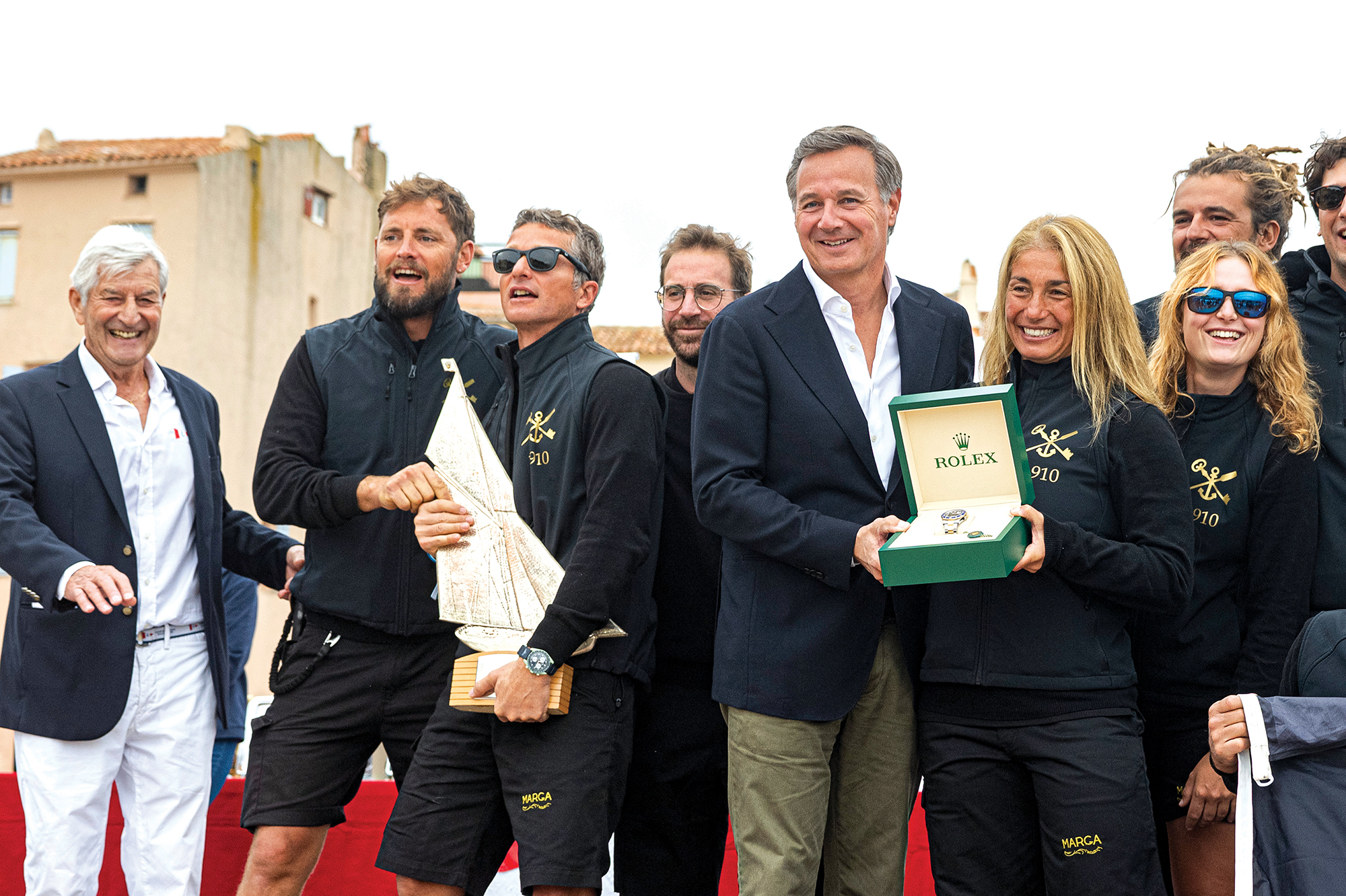 C’était à la bonne franquette ! « Avec les Voiles, c’est devenu plus professionnel» explique Pierre Roinson « On a la chance d’avoir de fidèles partenaires : BMW, Wally, Suzuki Marine, Rolex étant, depuis 2006, l’un des plus anciens. Ce partenariat permet d’accueillir d’autres manifestations internationales de qualité programmées en 2025. » Eh oui ! Créateur du prestigieux Trophée Rolex dédié à des yachts classiques, l’horloger suisse, soutien des plus grandes manifestations nautiques du globe, a un faible pour les Voiles, tout comme les beautiful people de ce monde! La SNST, association gérée comme une véritable entreprise avec un budget de deux millions d’euros dont la moitié dédié uniquement aux Voiles, est sans cesse à la recherche de nouveaux alliés. En 2025, la Banque Rothschild a rejoint le cercle pour trois années, fournissant également du champagne sur la manifestation. Les partenaires locaux sont aussi précieux, tels les domaines viticoles de la presqu’île de Saint-Tropez. Parmi les plus fidèles, il y a l’incontournable Château Saint-Maur Cru Classé. Depuis quatre ans, il fournit le carré VIP et le bar des Voiles, appréciant la visibilité incontestable offerte à ses excellents vins. Autre domaine de la presqu’île de Saint-Tropez, Bertaud Belieu est également partenaire. Leur contribution est une pierre angulaire du succès de la manifestation, l’esprit de la fête, comme au temps de la Nioulargue, étant inscrit dans l’ADN des Voiles de Saint-Tropez.