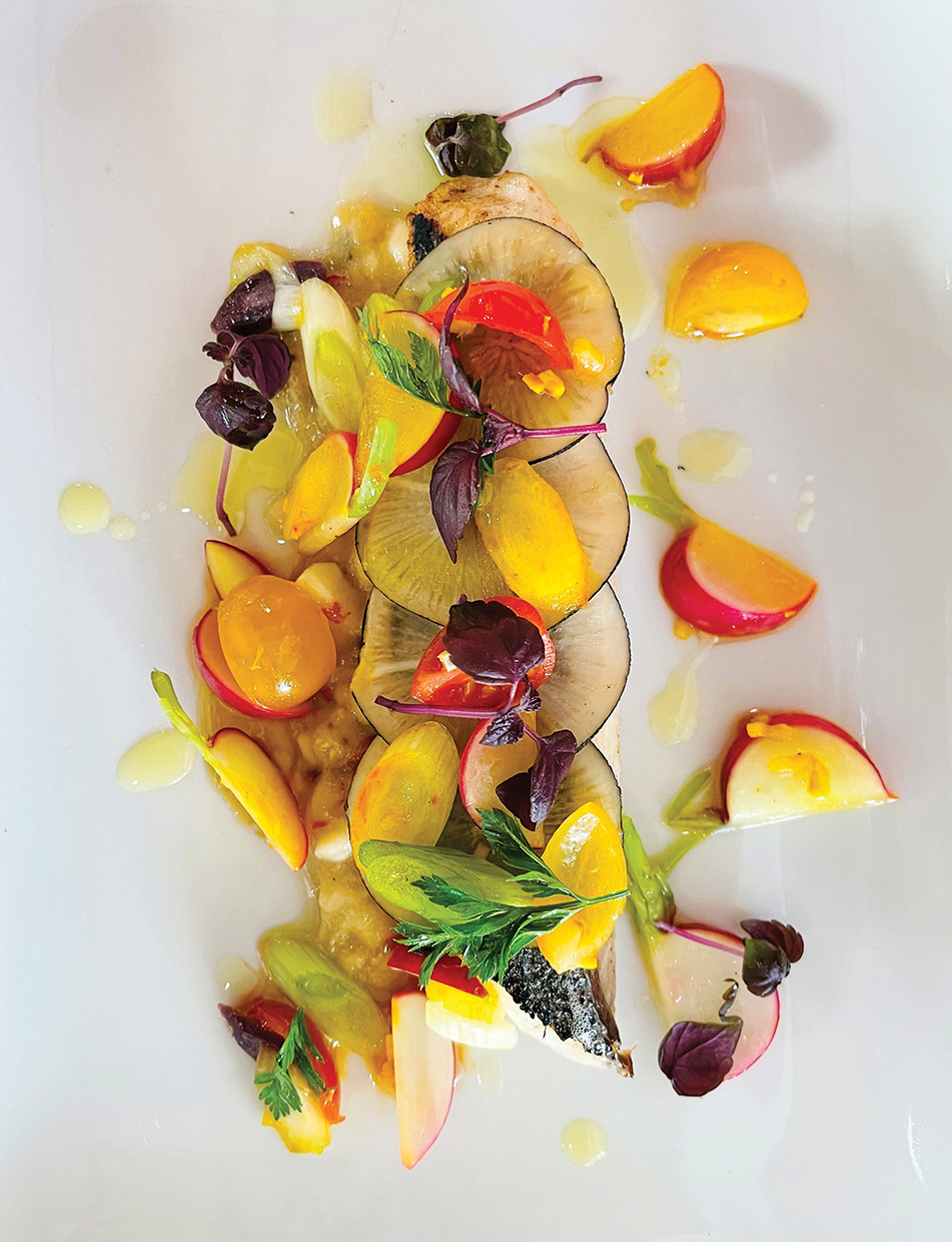 Filet de loup rôti vierge de printemps, confit d’aubergines